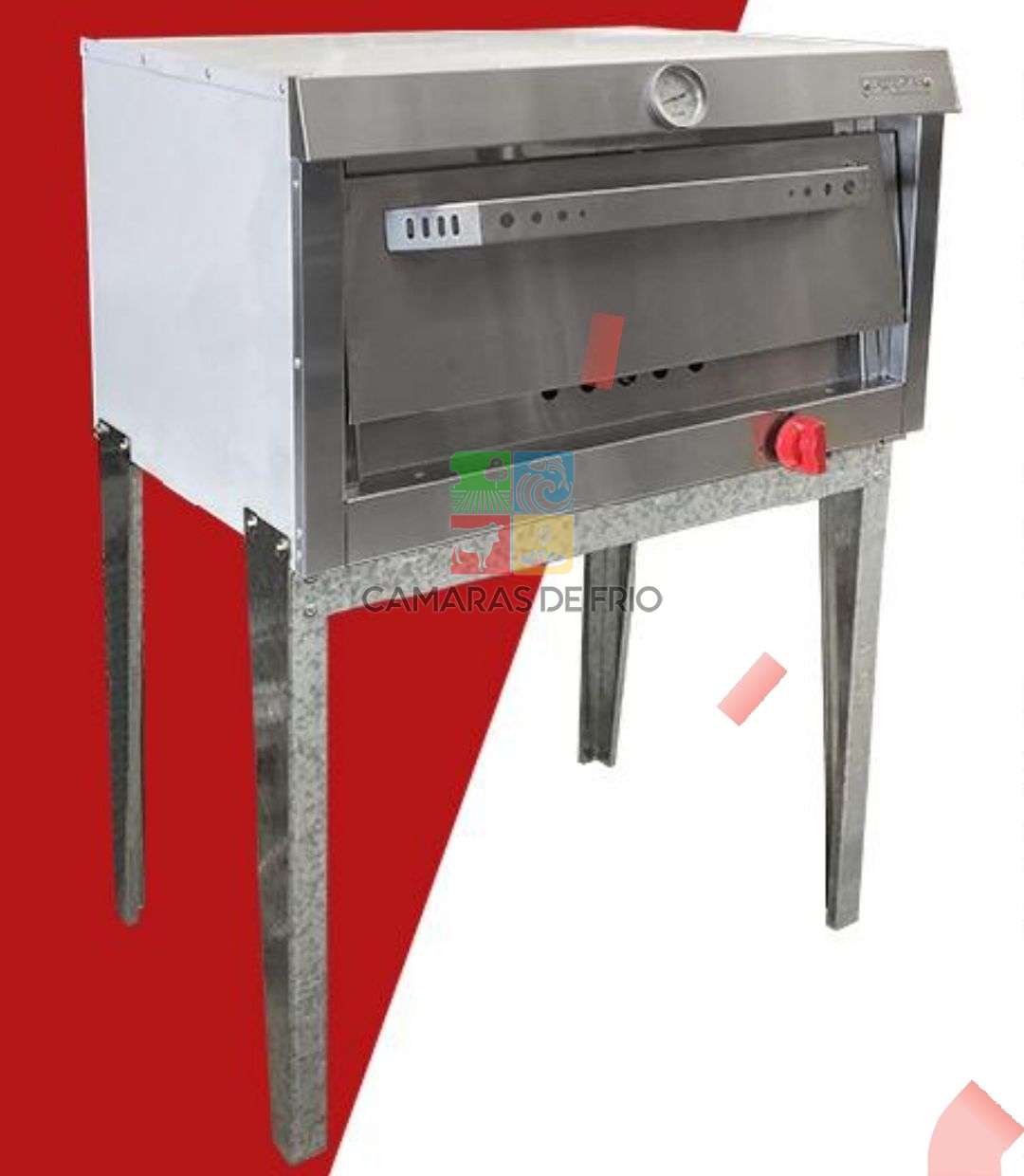 Horno de fabricación nacional certificado con cámara compacta que en su interior es de acero inoxidable, posee aislamiento termico con lana mineral en su contorno y puerta para mantener temperatura, llave de gas industrial con termocupla de seguridad certificada de origen italiano, con llave de mando en 3 posiciones.